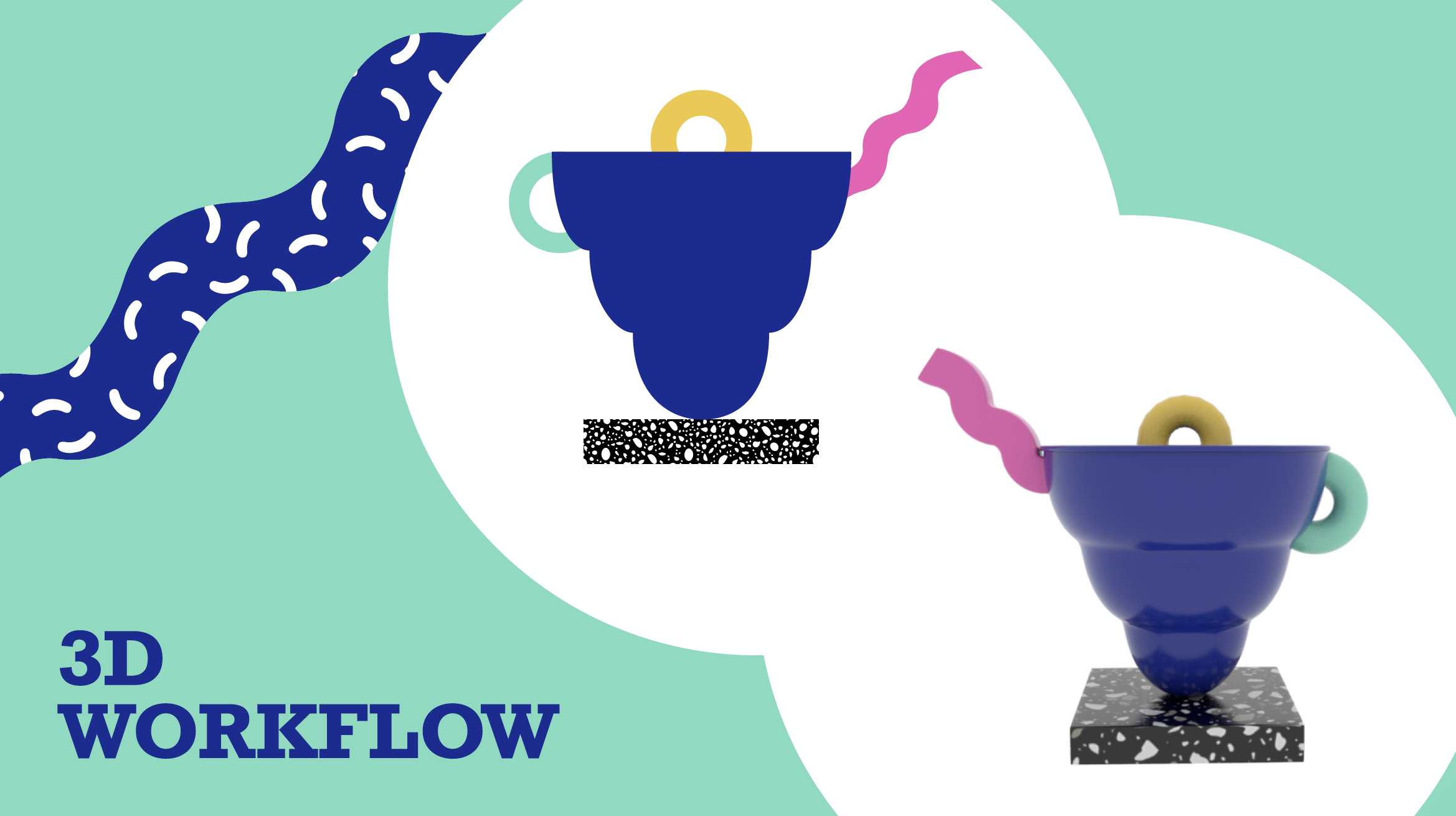 A 3D teapot model in the Memphis design style, created using Autodesk Maya.